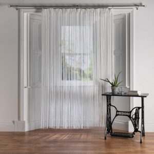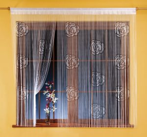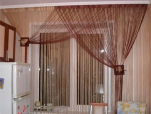 Для спальни чаще выбирают обычные шторы из нитей или дополненную стеклярусом.