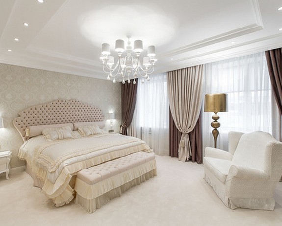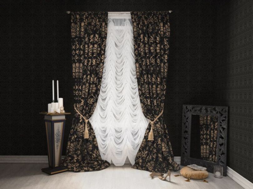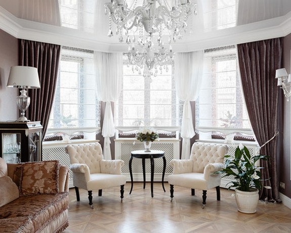 В классическом интерьере наиболее выигрышно будут выглядеть шторы из однотонных слоев текстиля. Допускается использование и ткани с орнаментом. В этом случае желательно делать только 1 слой из такого материала. Если же хочется, чтобы узорчатыми были оба полотнища, то следует подбирать портьеры с одинаковым рисунком, но разного оттенка. В любом другом случае двойные шторы будут выглядеть нелепо. Тонкая прозрачная занавеска (тюль, органза, вуаль) должна быть нейтрального оттенка или соответствовать одному из слоев плотной двойной портьеры.