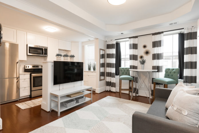 На фото интерьер гостиной и окна, украшенные шторами в полоску.