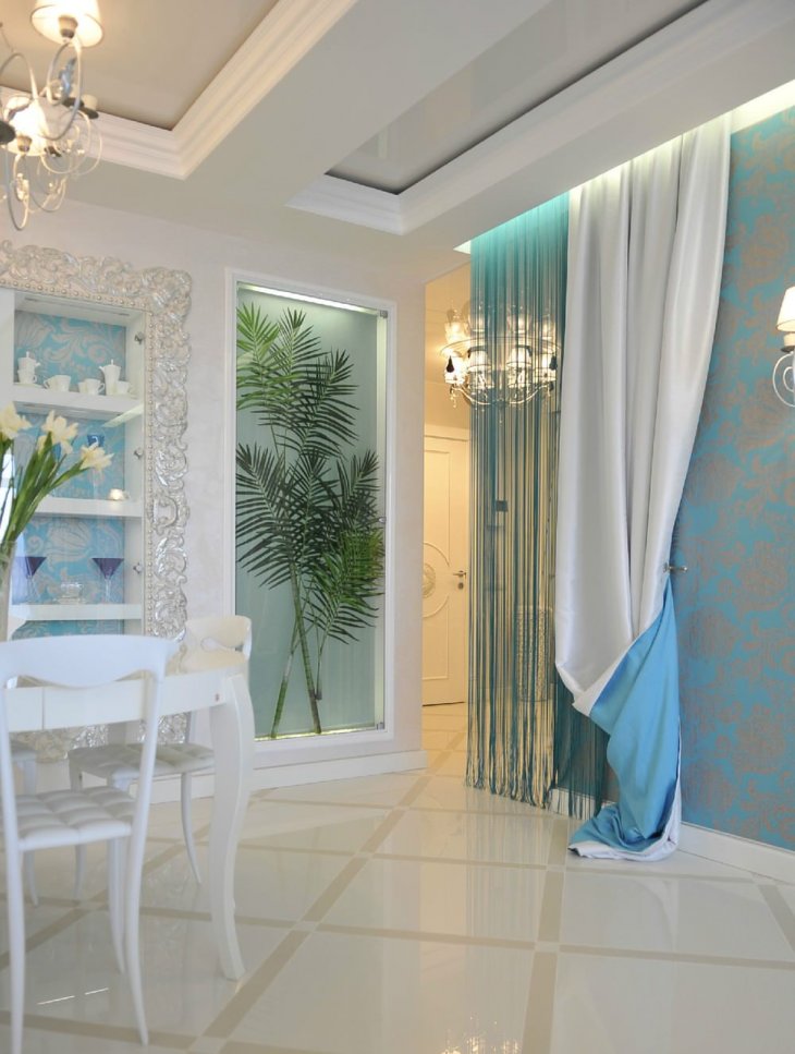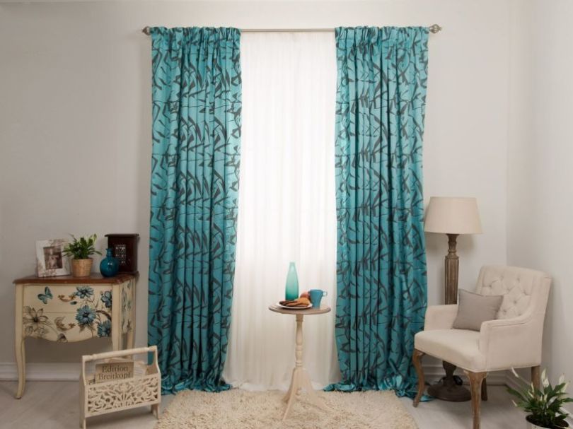 - если господствующие оттенки предметов мебели и декора стен светлые (бежевые, серые), то уместно на окнах повесить шторы с яркими орнаментами (синих, голубых или бирюзовых тонов). Подобный контраст уместно использовать на кухне, в гостиной, так как он добавит комнатам настроения и яркости;
