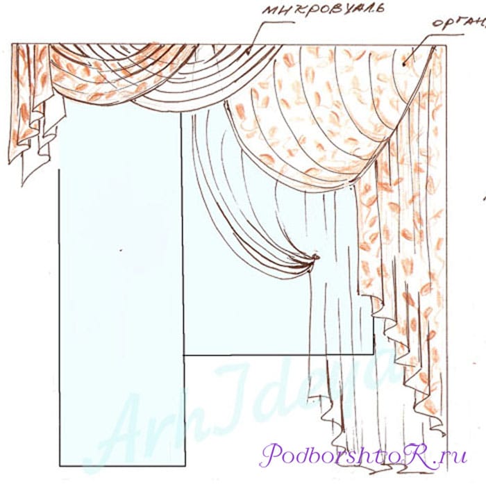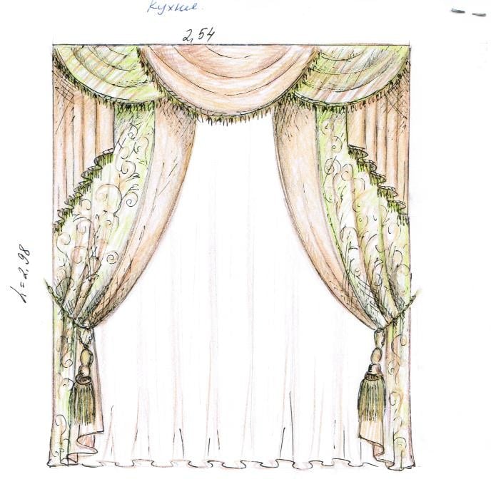 Рисуя эскизы штор для кухни, важно до мельчайших нюансов отобразить детали дизайна, учитывая складки ламбрекенов, драпировку базовой ткани и модель карниза. Достоверную картинку будущего интерьера можно получить, даже не имея специальных художественных навыков