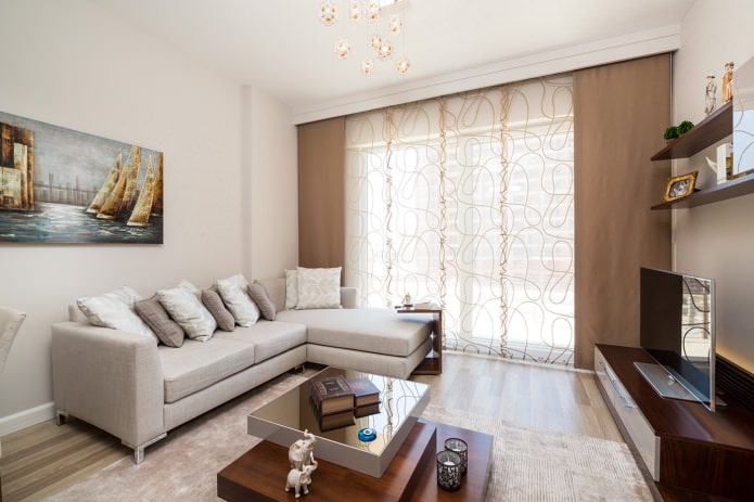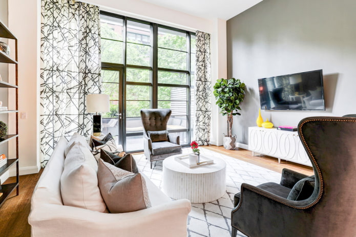 На фото гостиная в светлых тонах и шторы абстрактным принтом на окне.
