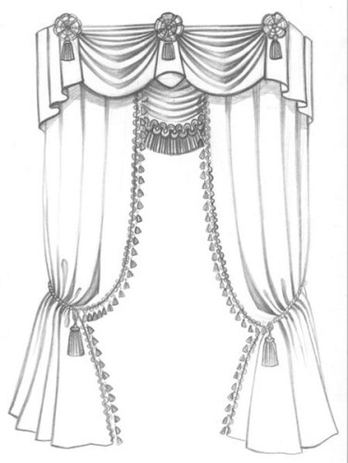 Главная задача дизайнера – включить в эскизы ламбрекенов и штор нюансы: от складок и разрезов на ткани, до подхватов и изгибов. Декоры для штор сразу бросаются в глаза, поэтому их тщательно выделяют, используя толстый карандаш.
