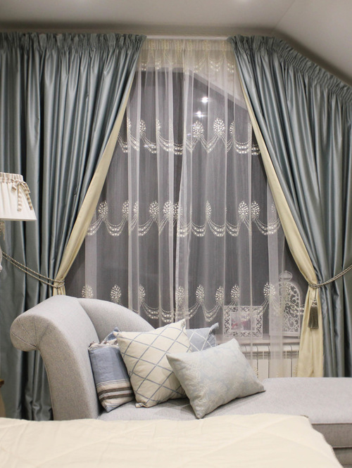 Еще одним видом нестандартных окон являются скошенные модели. Скошенные окна украсить довольно проблематично. Можно повесить карниз и, опустив прямую тюль, максимально приблизить скошенное окно к стандартному, закрыв незавершенную часть.
