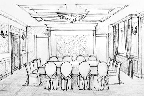 Важно делать контуры элементов четкими и не размытыми, чтобы заказчик понимал, где заканчивается одна деталь и начинается другая. Легче нарисовать эскиз римской шторы, чем эскизы штор для кафе или роскошного ресторана, предполагающих наличие многоярусных тканей
