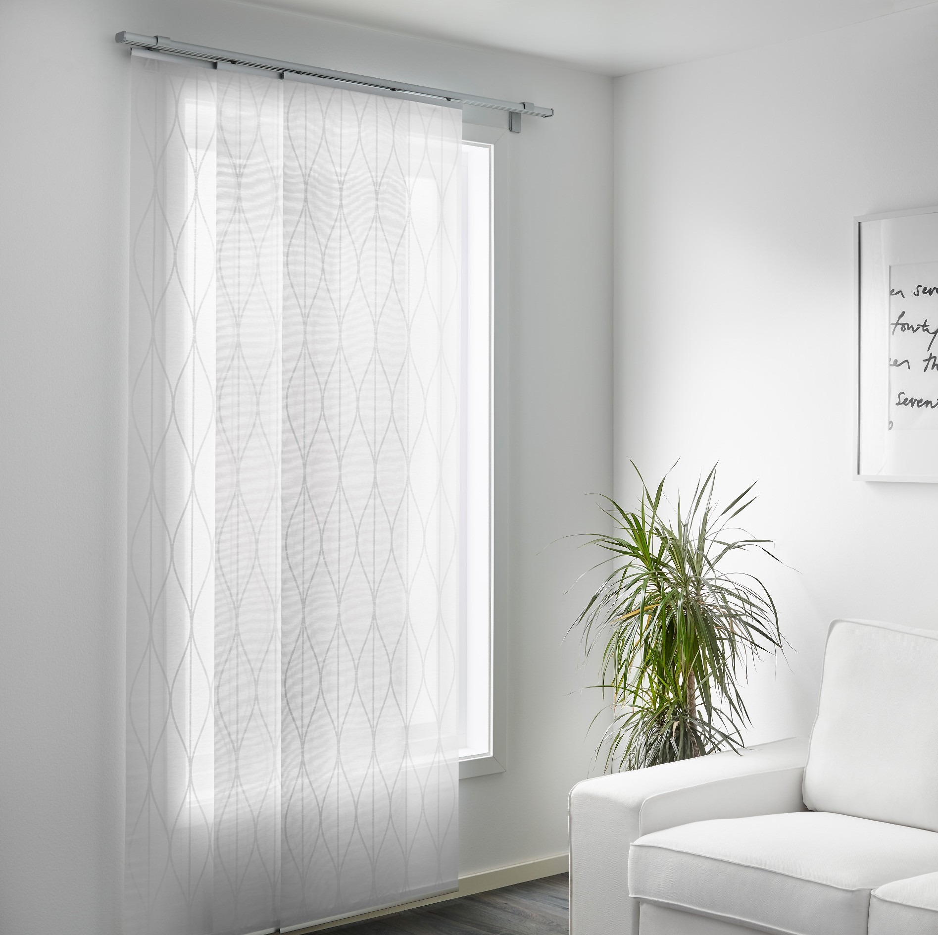 Популярны среди любителей японского стиля, хай-тек и минимализм. Японские панели ― узкие, длинные куски ткани, открывающие доступ к окну, перемещаясь по специальным направляющим. Ими не сложно закрыть обычный оконный проем и целый балкон.