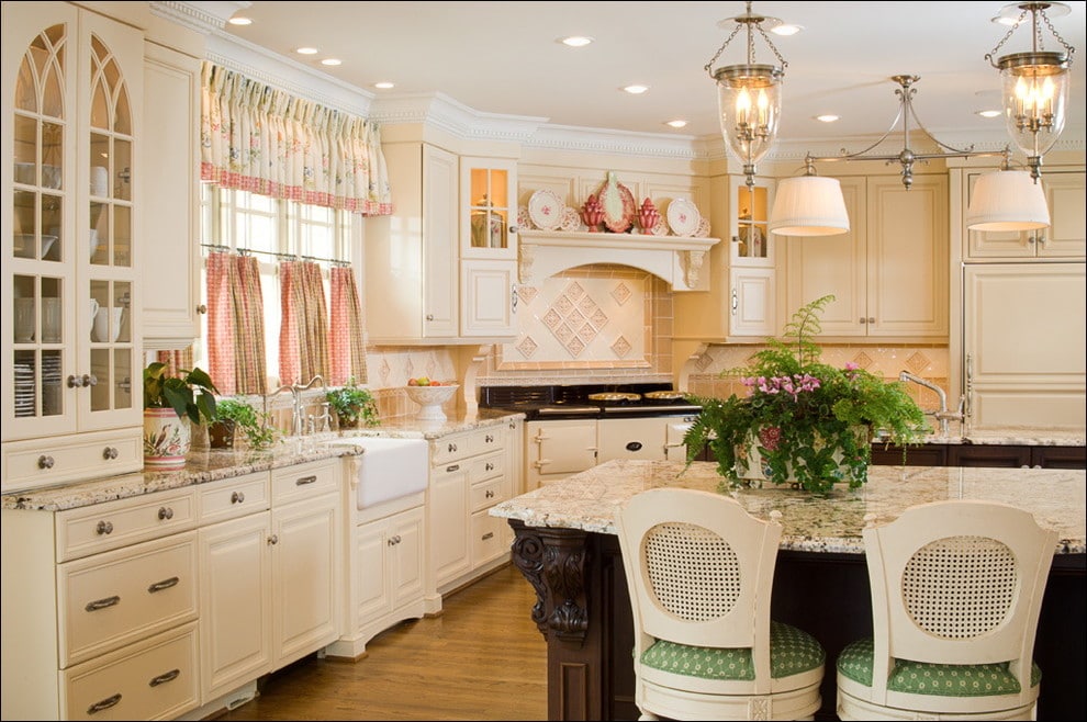 Что может быть удачнее для дизайна дачного домика, чем французский кантри-стиль, ведь часто на даче остается много дорогих сердцу вещей, которые не поднимается рука выбросить, потому что они связаны с воспоминаниями. Расположить в интерьере такие предметы поможет именно стиль кантри, ведь он позволяет разместить на стенах кухни стеллажи, а в комнате – открытые шкафы. К такому стилю шторы с густыми драпировками и интенсивным рисунком подходят лучше всего.