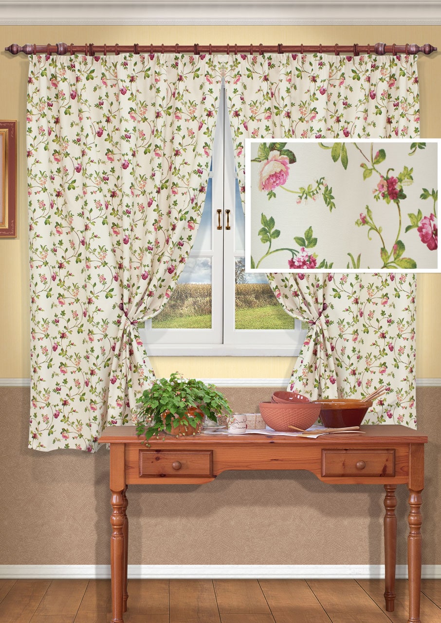Для создания стильного оконного украшения используются только природные материалы: набивной ситец, хлопок, небеленый лен или грубое полотно.