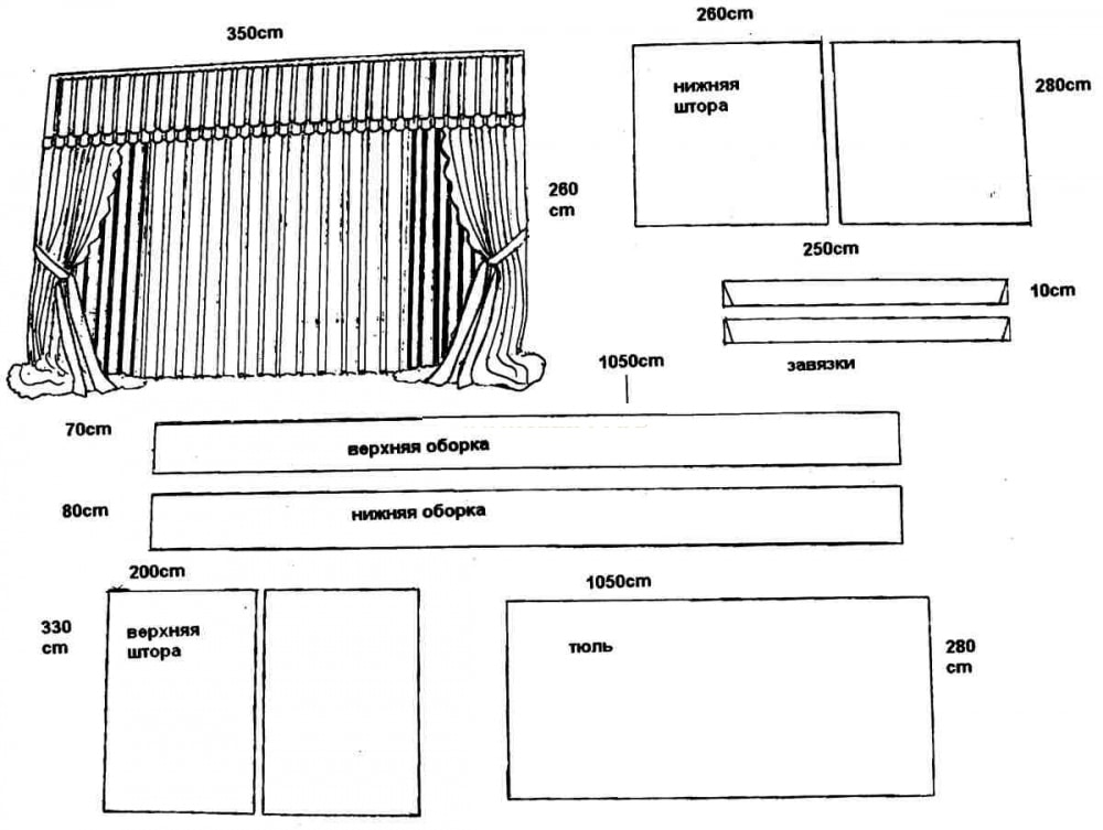 - Исходя из задуманного дизайна, делаем выкройки. Идеальный вариант для новичков в швейном деле – шторы из двух вертикальных полос с небольшой верхней оборкой-ламбрекеном.