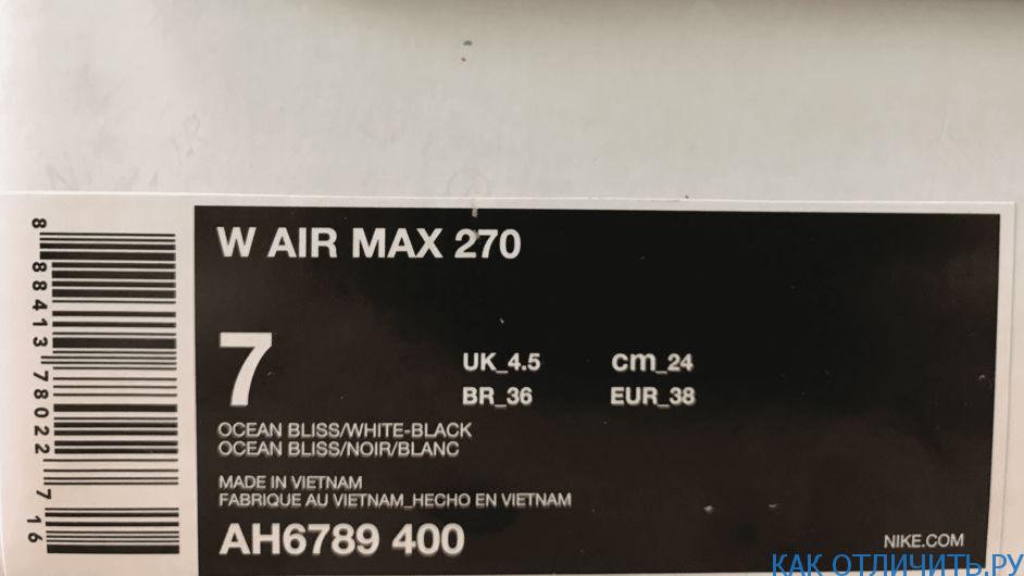 Во-первых, оригинальные кроссовки продаются в белой коробке с штампами r270 и принтами-голограммами Nike air и т.п. Во-вторых, имеется наклейка с обозначением модели, номенклатурным номером, размером и страной-производителем. Номер на коробке должен быть таким же, как на нашивке в кроссовке. Паленые кроссовки часто приезжают в коробках других цветов, и, разумеется, без стикеров.