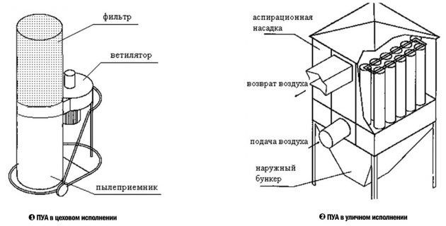 С помощью установок ПУА и ПУАК удаляется сухая, не слипшаяся стружка и пыль. Поскольку данные системы обладают небольшим напором, их следует устанавливать на расстоянии, не превышающем трех метров от станка. Показатели производительности таких агрегатов колеблются в пределах 1250-3900 м³ за один час. В этих устройствах нет механизмов, регенерирующих фильтрующие поверхности. Системы ПУА требуют регулярного снятия и очистки от накопившейся пыли фильтрационного рукава, при этом частота таких очисток зависит от фракции частиц — чем они мельче, тем чаще приходится их вытряхивать.