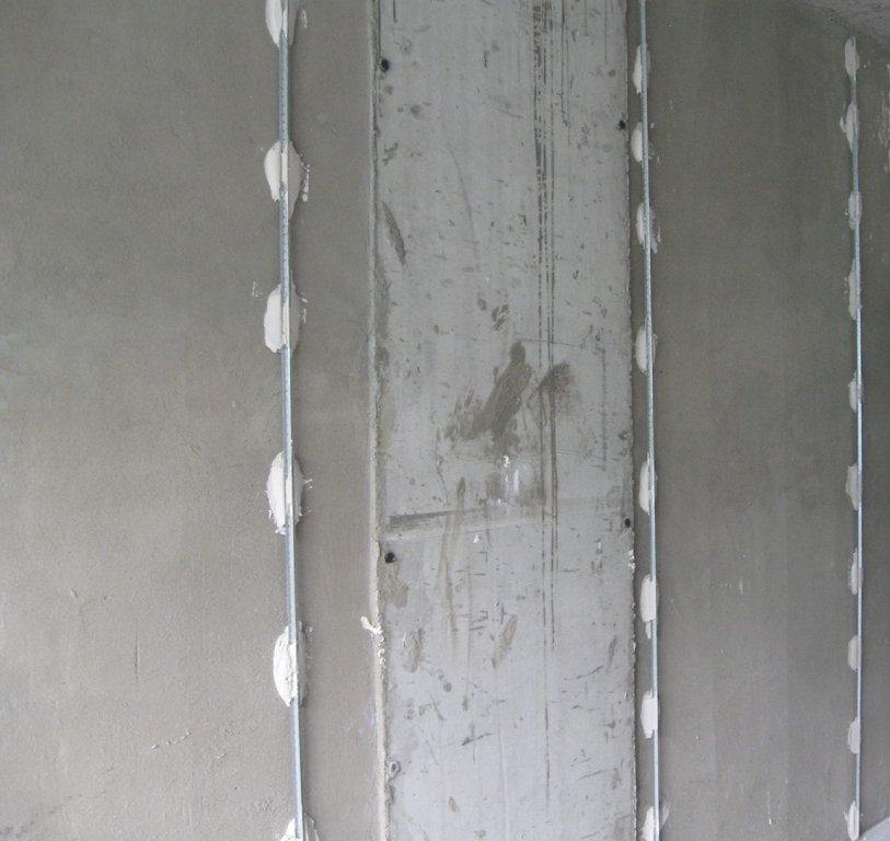 - Установите на стены маяки-рейки. Они должны располагаться строго вертикально, крайние должны находиться на расстоянии 30 см от примыкающей стены. По ним на расстоянии примерно 1,2 м выставляют остальные. К стене рейки крепятся с использованием штукатурного раствора, нанесенного на стену с шагом 20 см.