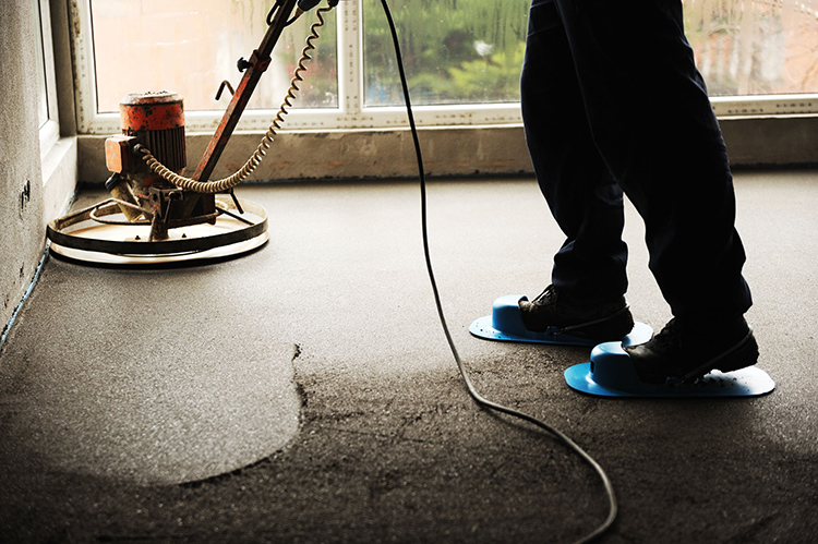 - в состав раствора вводится небольшое количество воды, что значительно ускоряет скорость высыхания бетона. Затирка может выполняться через несколько часов после формирования стяжки. Работы выполняются в специальной обуви, обеспечивающей равномерное давление на поверхность пола;
