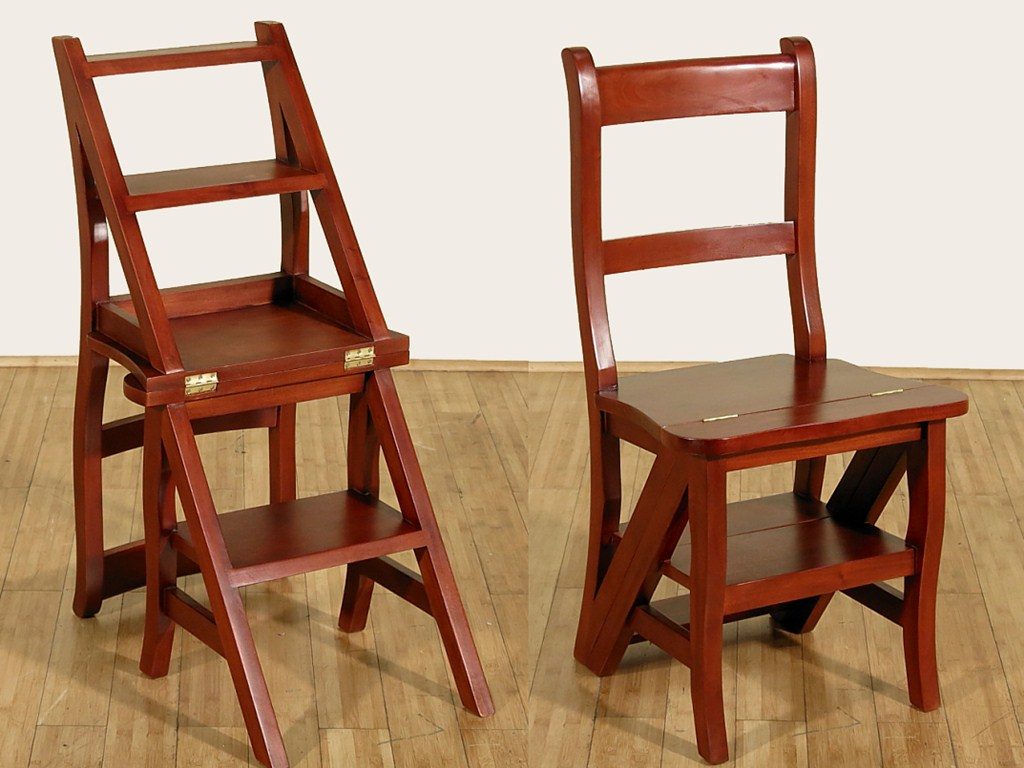Стул-лестница может быть простой вариацией обычного табурета с завышенным сидением или же представлять собой трансформер. В последнем случае для того, чтобы воспользоваться ступенями, изделие нужно перевернуть, а точнее, установить одну его половину на вторую.