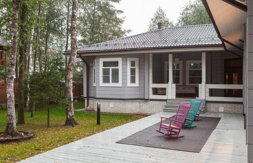 - Финский стиль – полное или частичное остекление стен, хорошо смотрится с деревом и кирпичом. Также в дизайне присутствуют кованые изделия, которые еще больше подчеркивают выбранное направление. Если дом построен в финском стиле, то крыльцо должно быть небольшим, но при этом в качестве строительного материала, помимо дерева, можно использовать и камень в сочетании со стеклом.