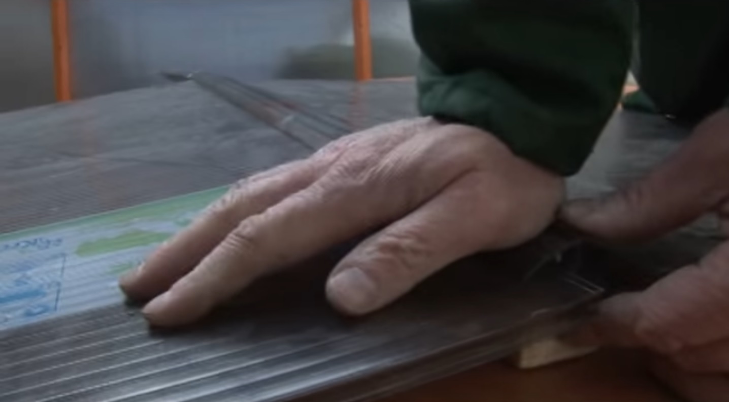 Шаг 3. В боковые пазы базы помещаем листы поликарбоната с двух сторон.