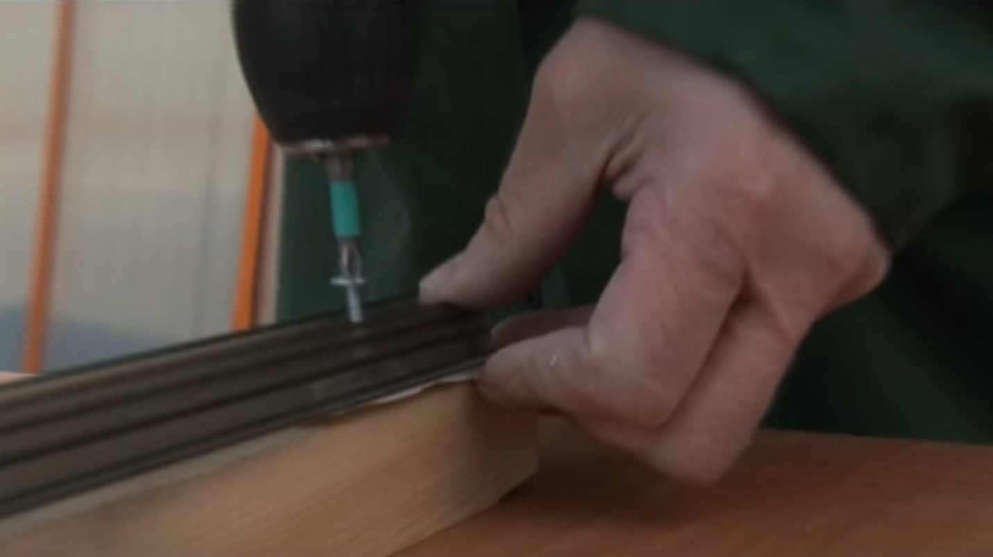 После того, как будут подготовлены отверстия или установлены крепежные элементы, прикрутите соединительный профиль. Внимательно следите за тем, чтобы края профиля плотно прилегали и к ламинату, и к плитке.