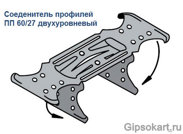 Перекрестное соединение потолочных профилей производится при помощи специальных соединителей. Соединение профилей потолочных в потолке одноуровневом производится соединителем одноуровневым для потолочных профилей ПП 60/27, простое название «краб».