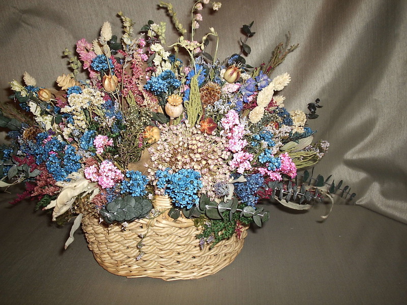 Для составления композиций с сухоцветами подойдет любая плетеная корзинка. В качестве основания для крепления цветов используют флористическую губку, которой наполняют корзинку. Сверху губку маскируют мхом и приступают к креплению сухоцветов. В дальнейшем можно будет только заменить цветы на более свежие.