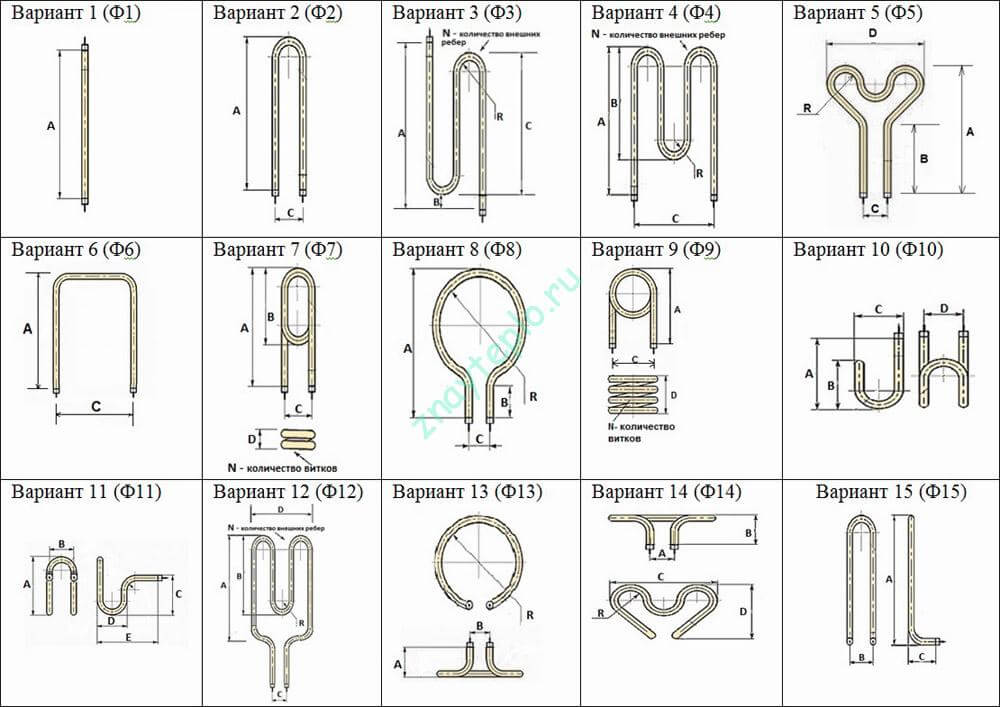 Более подробно все расшифровано в ГОСТе 13268-88. Для воздушных ТЭНов прописано наличие или отсутствие обдува и даже необходимая скорость воздуха. Если вы будете использовать ТЭНы предназначенные для обдува на спокойном воздухе, то они быстро перегорят из-за слишком большой удельной мощности. Для полноты обзора добавлю картинку с формами. Это поможет вам легче в них ориентироваться: