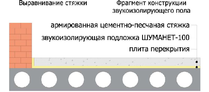 При устройстве «плавающего» пола ШУМАНЕТ-100 укладывается под стяжку стеклохолстом вниз, битумной поверхностью вверх. Полотнища материала раскатываются по поверхности плит перекрытия с нахлестом 20 мм, стыки проклеиваются скотчем. Чтобы исключить соприкосновение бетонной стяжки с поверхностью стен, полотнища ШУМАНЕТ-100 заводятся на стены на высоту чуть большую высоты устраиваемой стяжки. Стяжка должна иметь поверхностную плотность не менее 100 кг/м2 и толщину 60 мм, а также в обязательном порядке должна быть армирована металлическими конструкциями.