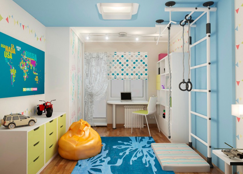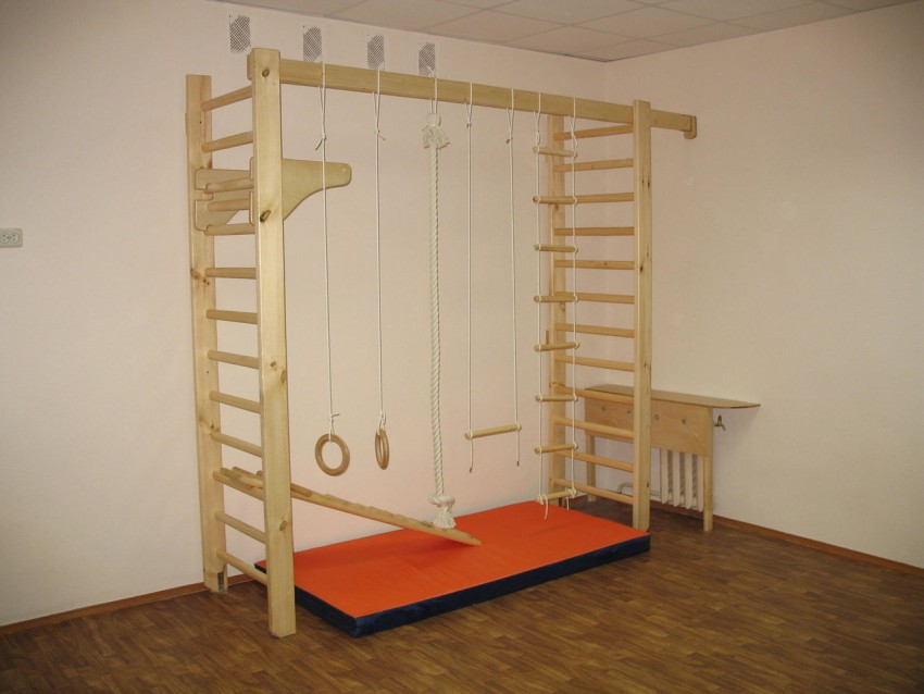 Взгляните на фото шведской стенки в детскую и обратите внимание на обязательное наличие противоскользящей обработки поверхности и мягкого, стойкого к износу материала на кольцах, брусьях, турнике.