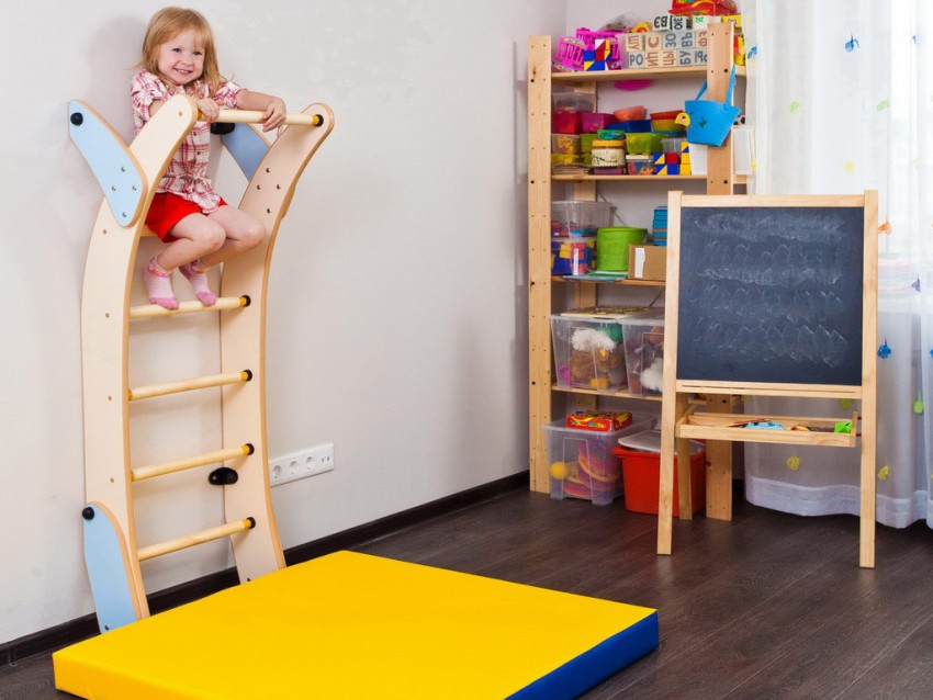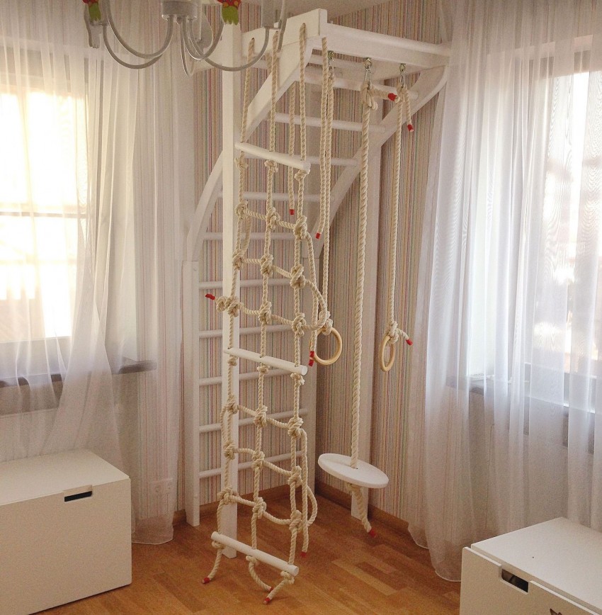 Помимо игрушки, лестница послужит хорошим тренажером, который укрепит детские мышцы и кости, поспособствует развитию вестибулярного аппарата и реакции. Ее можно установить возле шведской стенки, где она будет выполнять функцию инвентаря (как готовый спортивный комплекс), так же, как кольца и канаты.