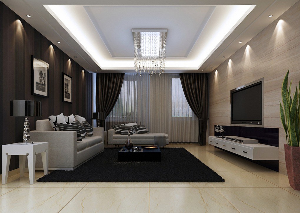Дизайнеры не рекомендуют использовать темные цвета при оформлении потолков, так как это визуально уменьшает помещение и вызывает чувство дискомфорта. Потолок гостиной лучше всего сделать глянцевым и светлым – в этом случае он зрительно увеличит пространство и внесет свою неповторимую атмосферу в общую ауру помещения.