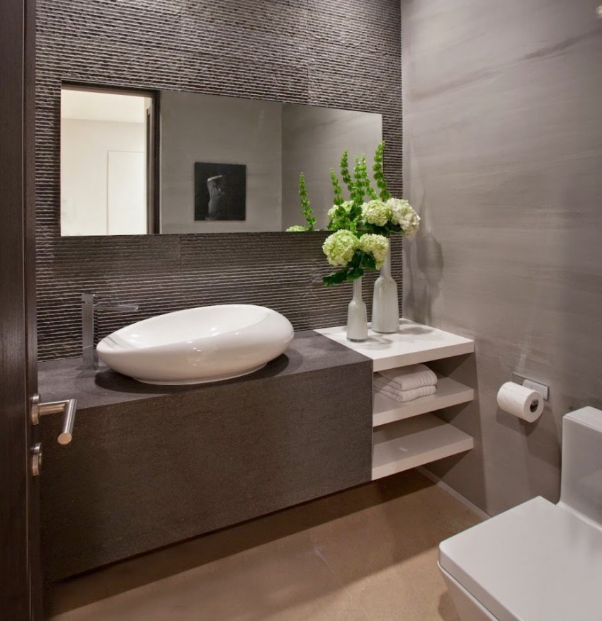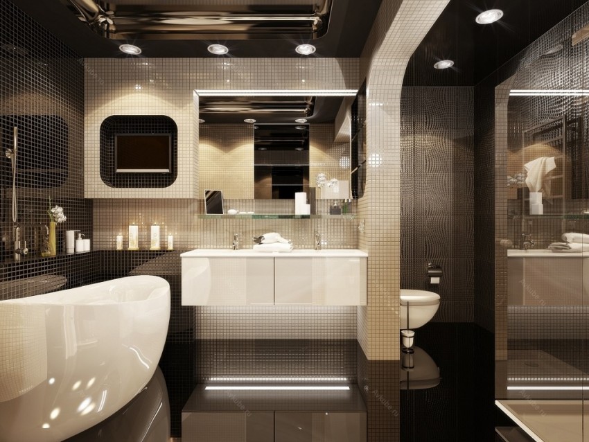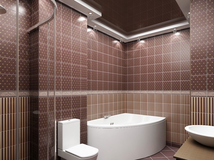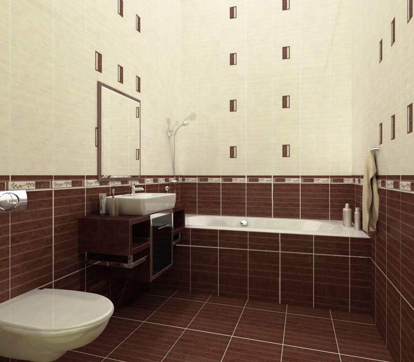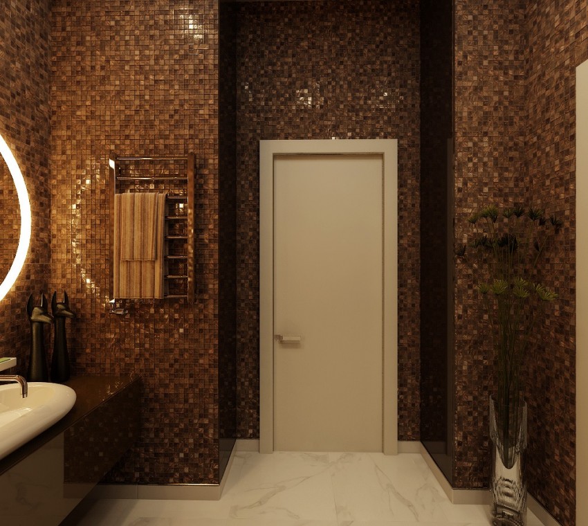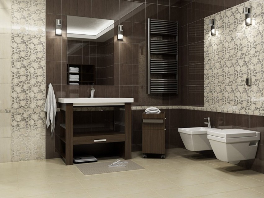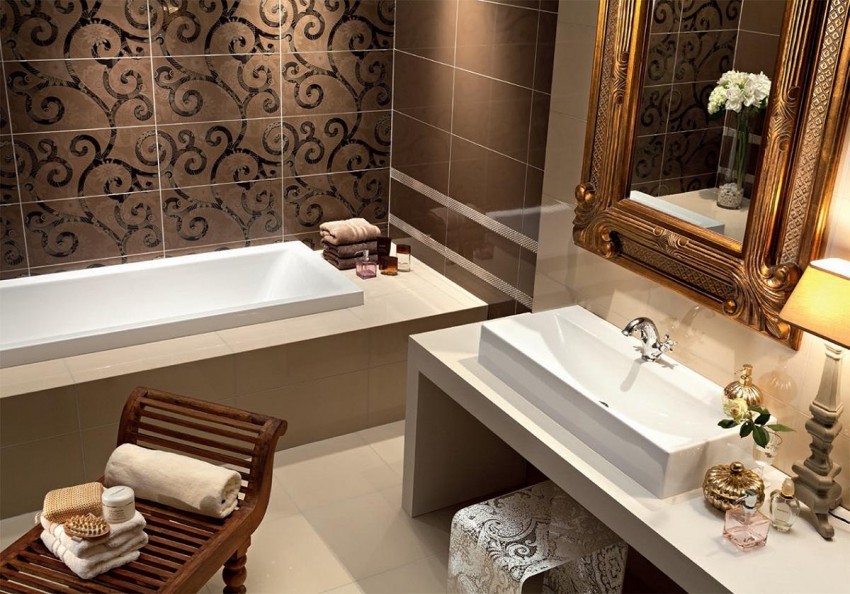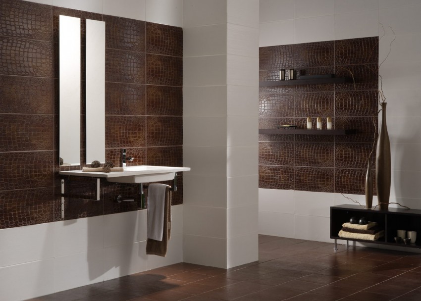 В темных интерьерах часто применяется плитка цвета шоколада, а отделка или акценты – светло-кофейных красок. Эффектно выглядит керамическая плитка, имитирующая природный камень красивого песочного оттенка.