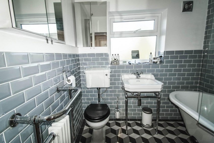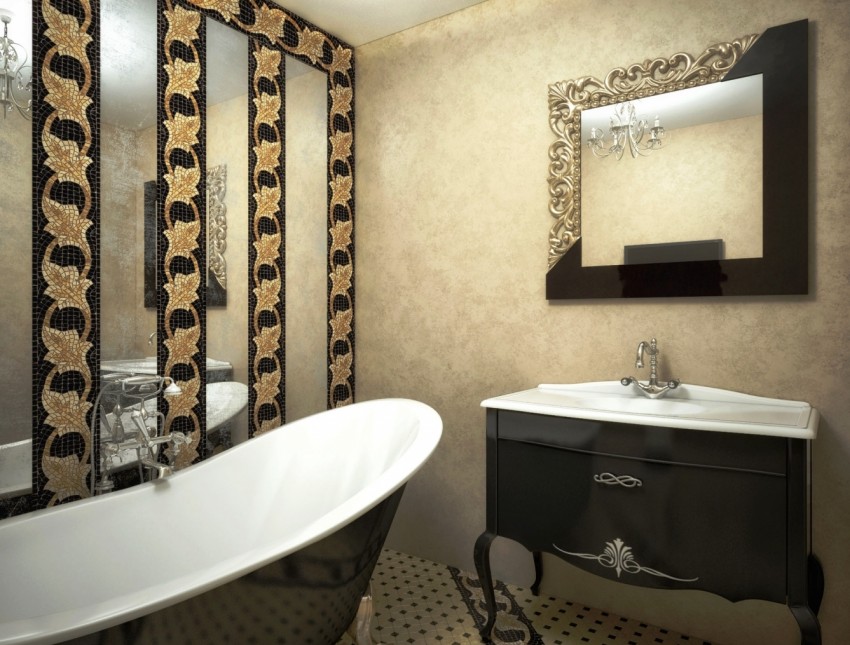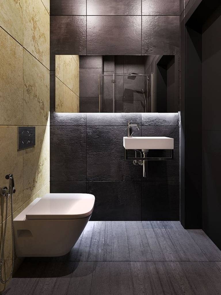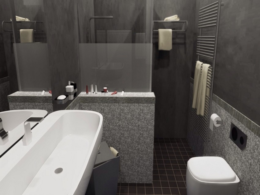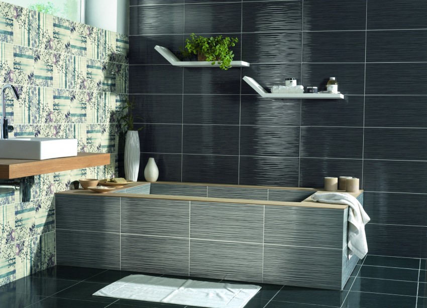 Если темный пол в ванной, то лучше разбавить вкраплениями стены или сделать контрастный декор.