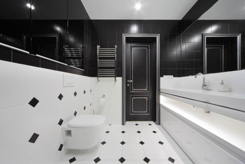 Что касается отделки потолка и пола, то ее рекомендуется произвести с помощью светлых материалов. Например, это может быть нежно-коричневый, пепельный или бежевый ламинат. Причем его поверхность может быть, как матовая, так и глянцевая. Кроме того, черные акцентные участки будут прекрасно контрастировать с белыми обоями в интерьере. Такие яркие решения чаще всего используют в более современных интерьерах.