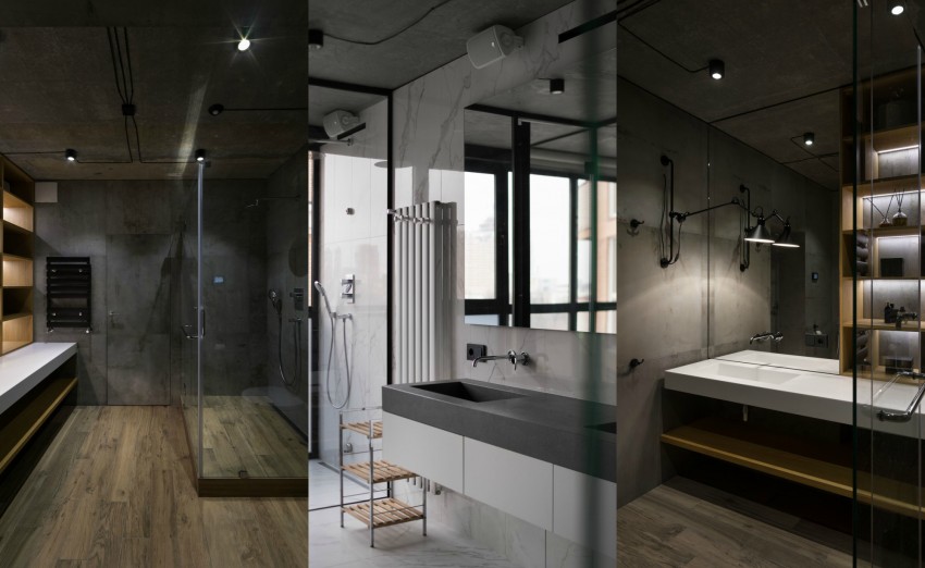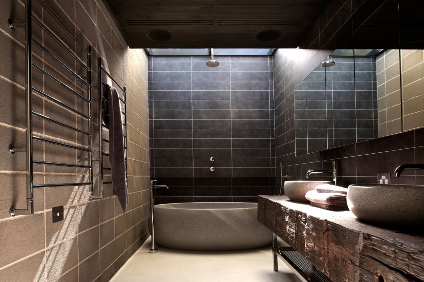 Если выбран стиль лофт, то стены из бетона, раковина из камня или роскошная столешница.