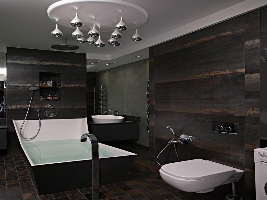Темная отделка далеко не всегда бывает «давящей» и тяжелой на восприятие. Во многих интерьерах подобное дизайнерское решение смотрится не просто органично, а поистине шикарно! Главное, ответственно отнестись к подбору полотен и расстановке предметов интерьера.