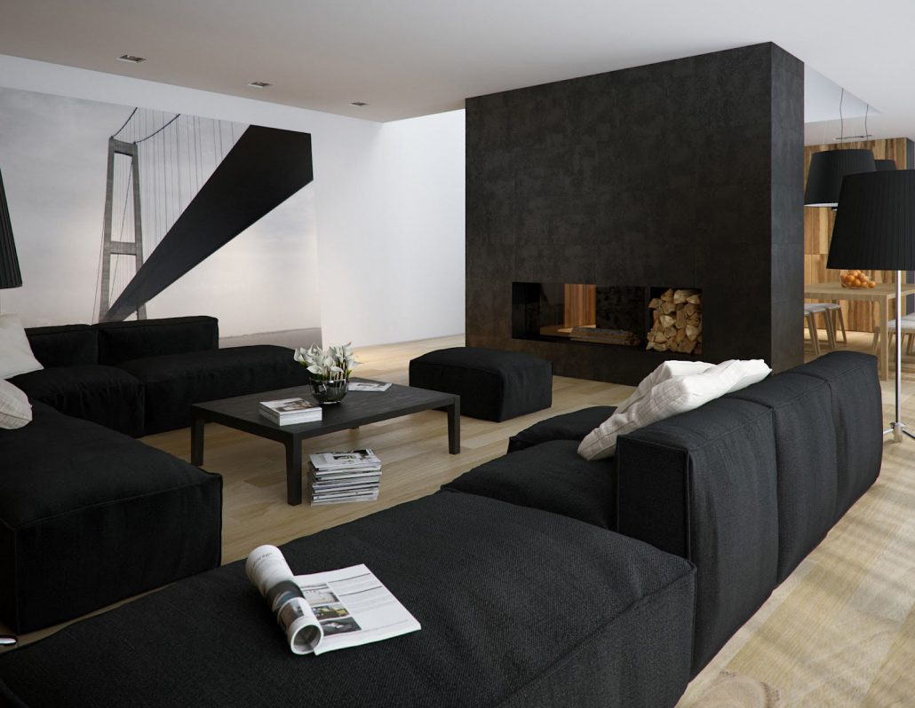 Черная мебель на фоне черных стен, белого потолка и бежевого пола