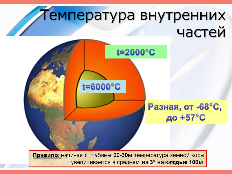 Средняя температура на планете Земля составляет 14,8ºС. По мере удаления от поверхности вглубь коры температура постепенно поднимается. Темп роста равен 3°С на каждые 100 метров. Это значение верно для любого региона, кроме нескольких аномальных зон.