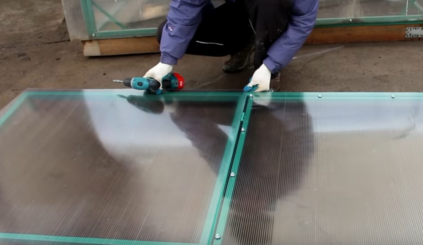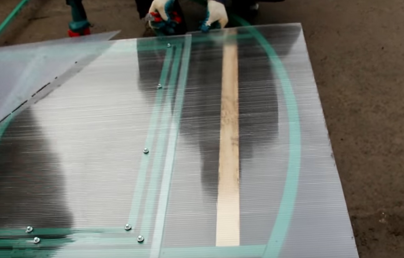 Поликарбонат вырезается на выступающих частях петель на створках дверей и форточек