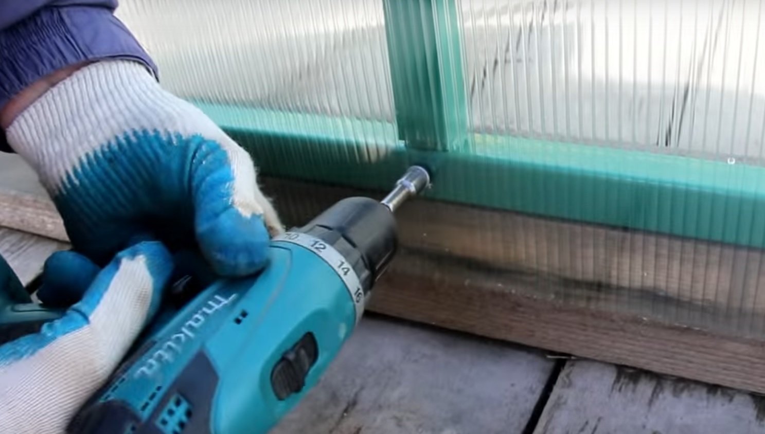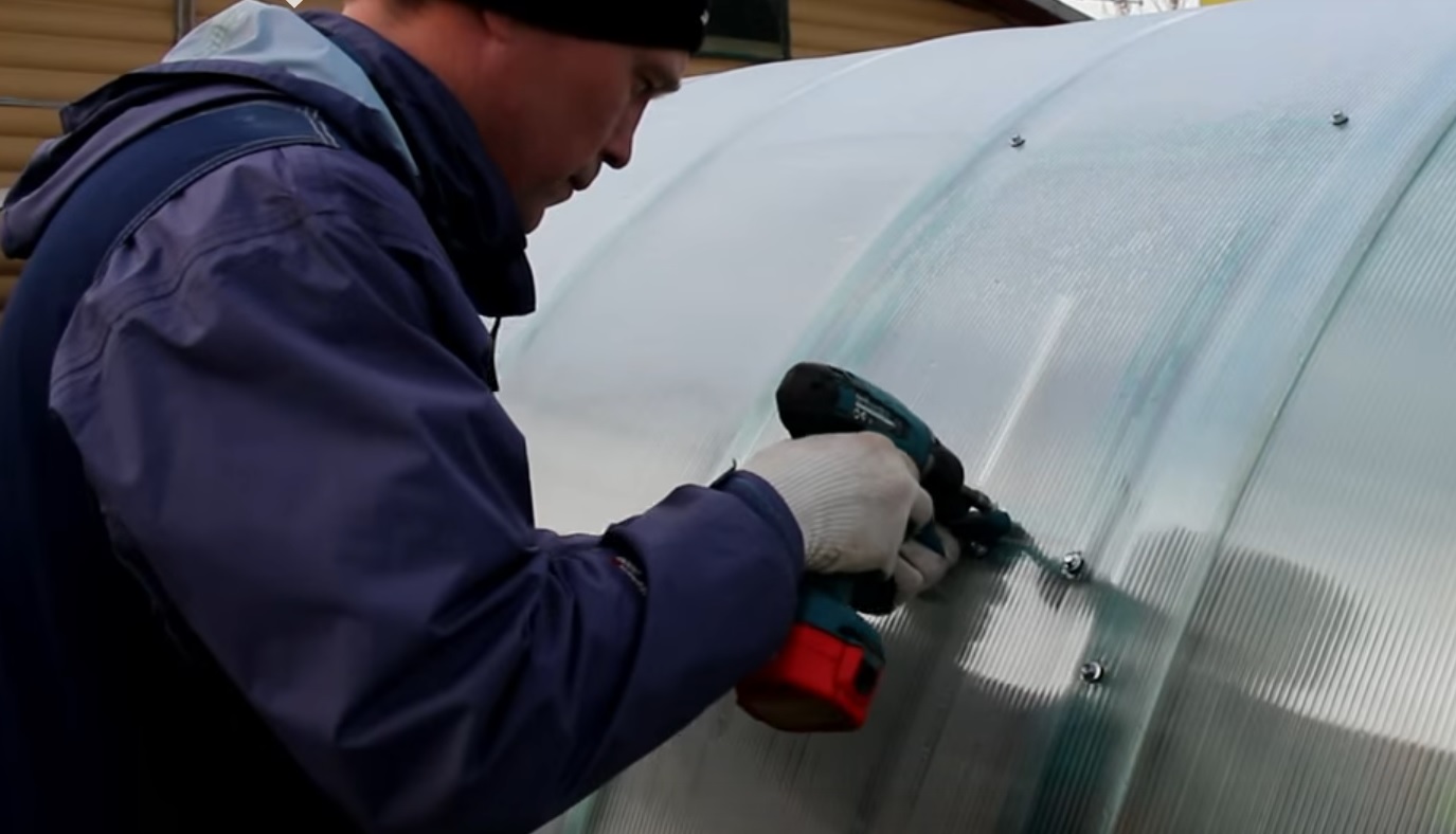 Шаг 21. Покрываем теплицу очищенным от пленки поликарбонатом. Крепим саморезами.