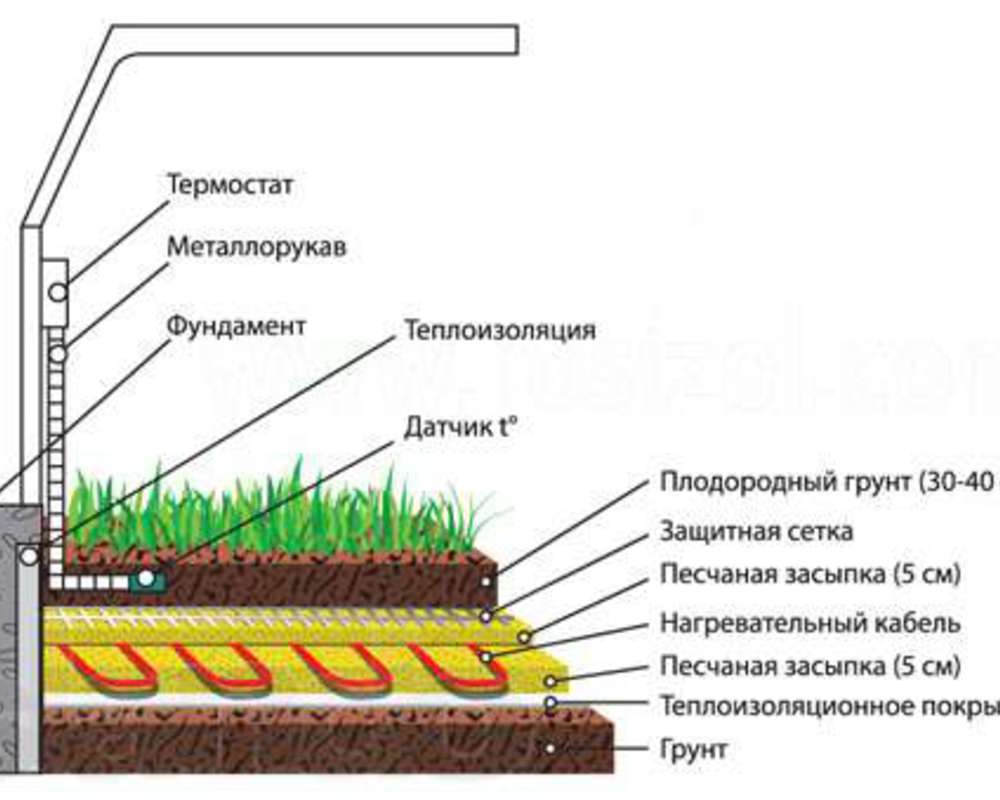 Эффективного обогрева можно добиться с помощью прокладки греющего кабеля или труб водяного отопления в грунте. Нагретый грунт способен длительно отдавать тепло в пространство теплицы и согревать воздух.