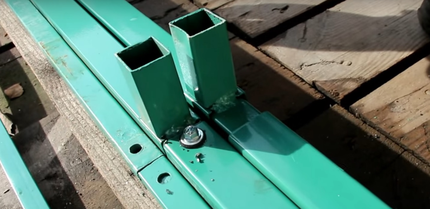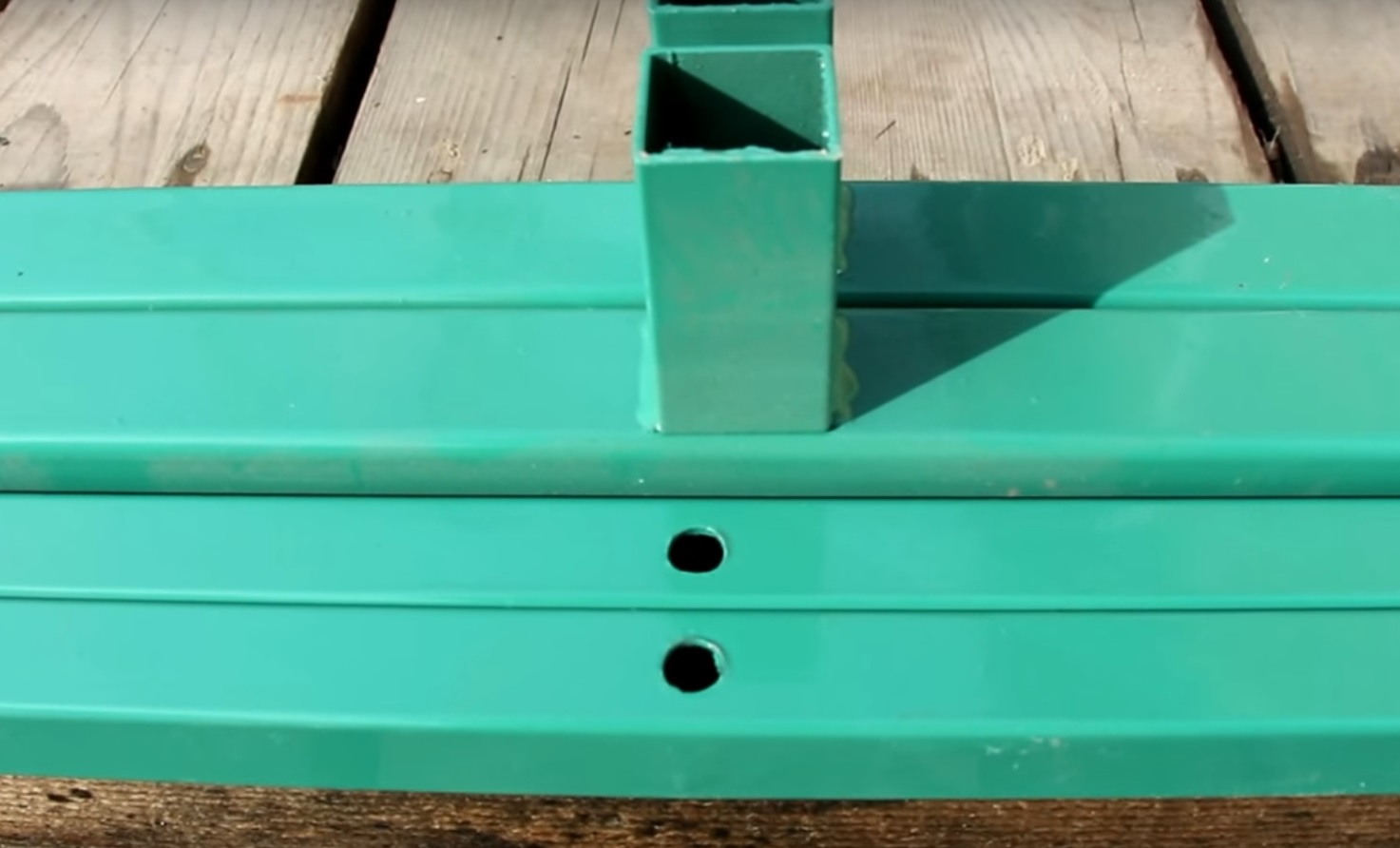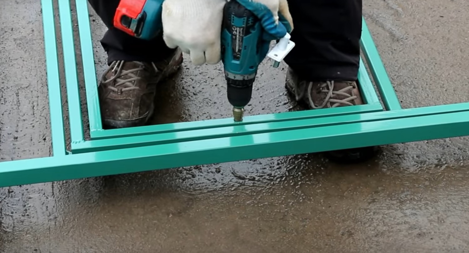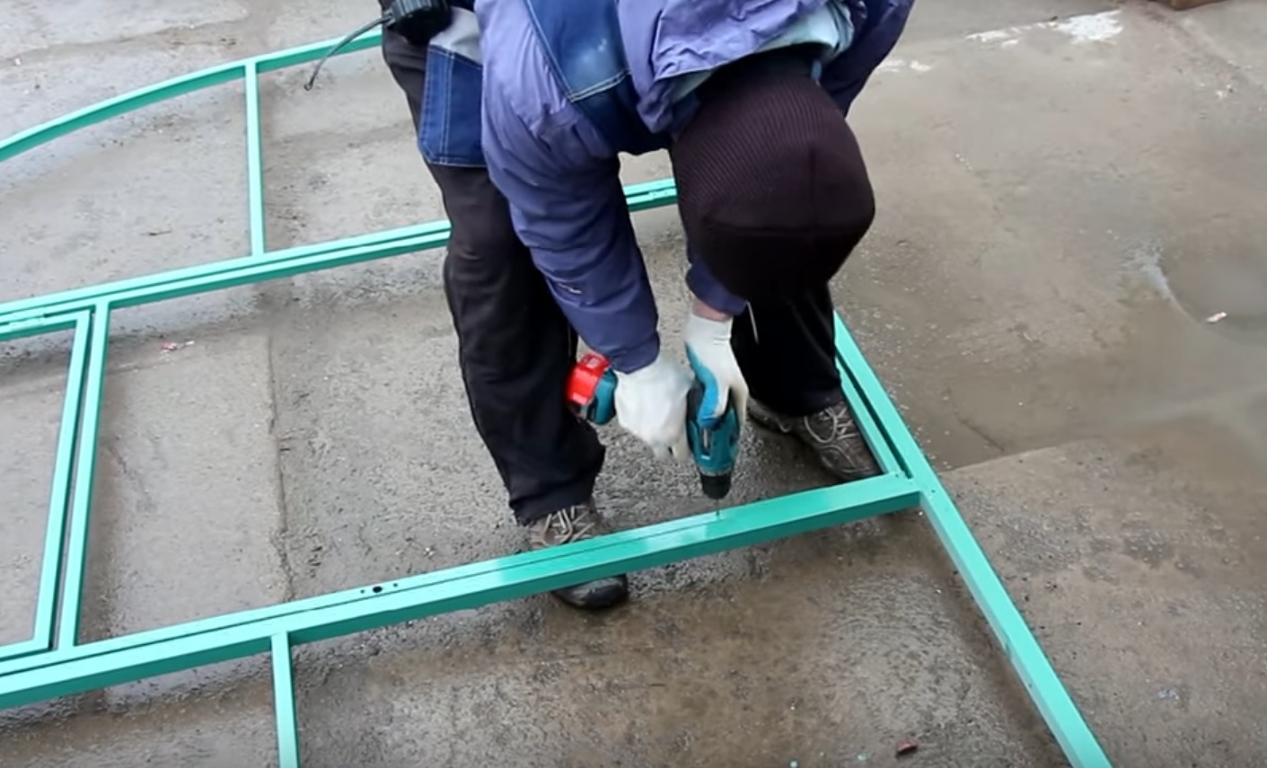 Шаг 3. Цельные сварные торцевые части теплицы укладываем на ровную поверхность. Под их верхнюю часть кладем небольшие деревянные бруски и сверлим отверстия для ручек и их крепления.