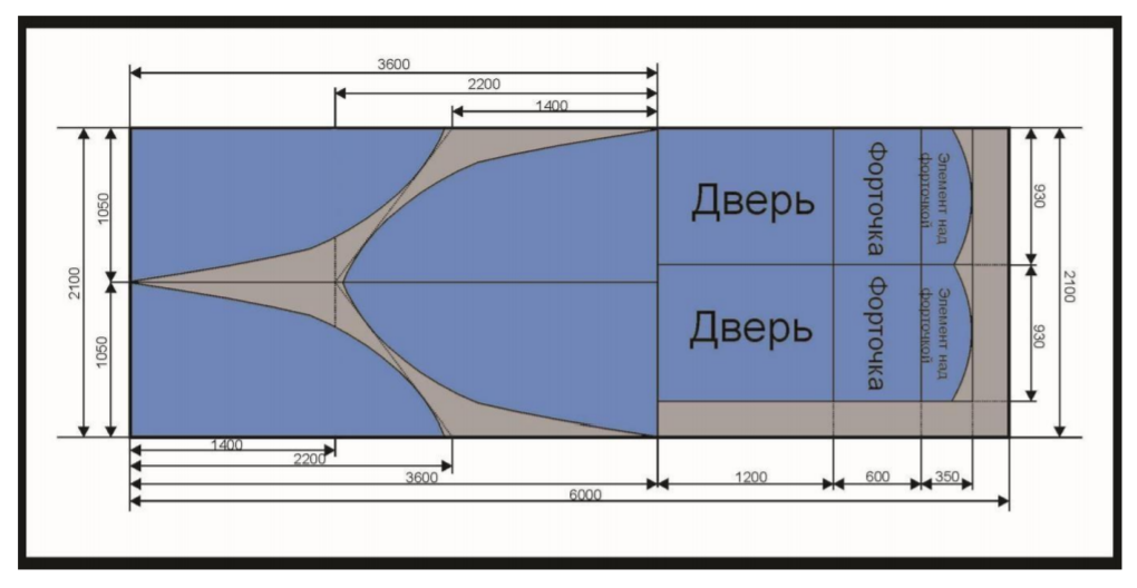 Шаг 2. Складываем получившиеся отрезки друг на друга лицом к лицу и выравниваем. Делаем разметку маркером по размерам, указанным в инструкции, и разрезаем сложенные куски. Получится шесть деталей материала, которыми мы будем укрывать торцевые части теплицы.