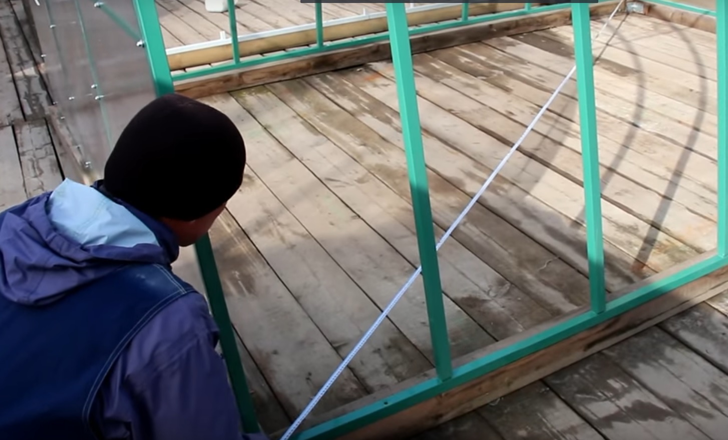 Шаг 20. Измеряем диагонали теплицы, чтобы убедиться, что конструкция стоит ровно. Они должны быть равными.