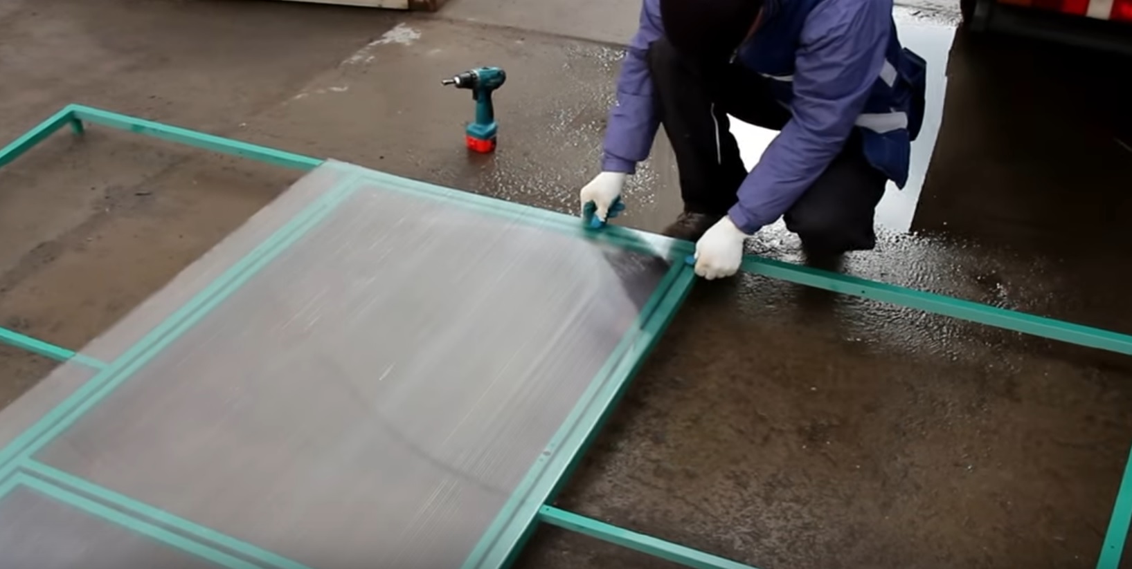Шаг 5. Удаляем защитную пленку с материала и ровно укладываем прямоугольные куски поликарбоната на двери. Закрепляем их шайбами и кровельными саморезами в нижней и средней частях листа, верхнюю пока не трогаем.