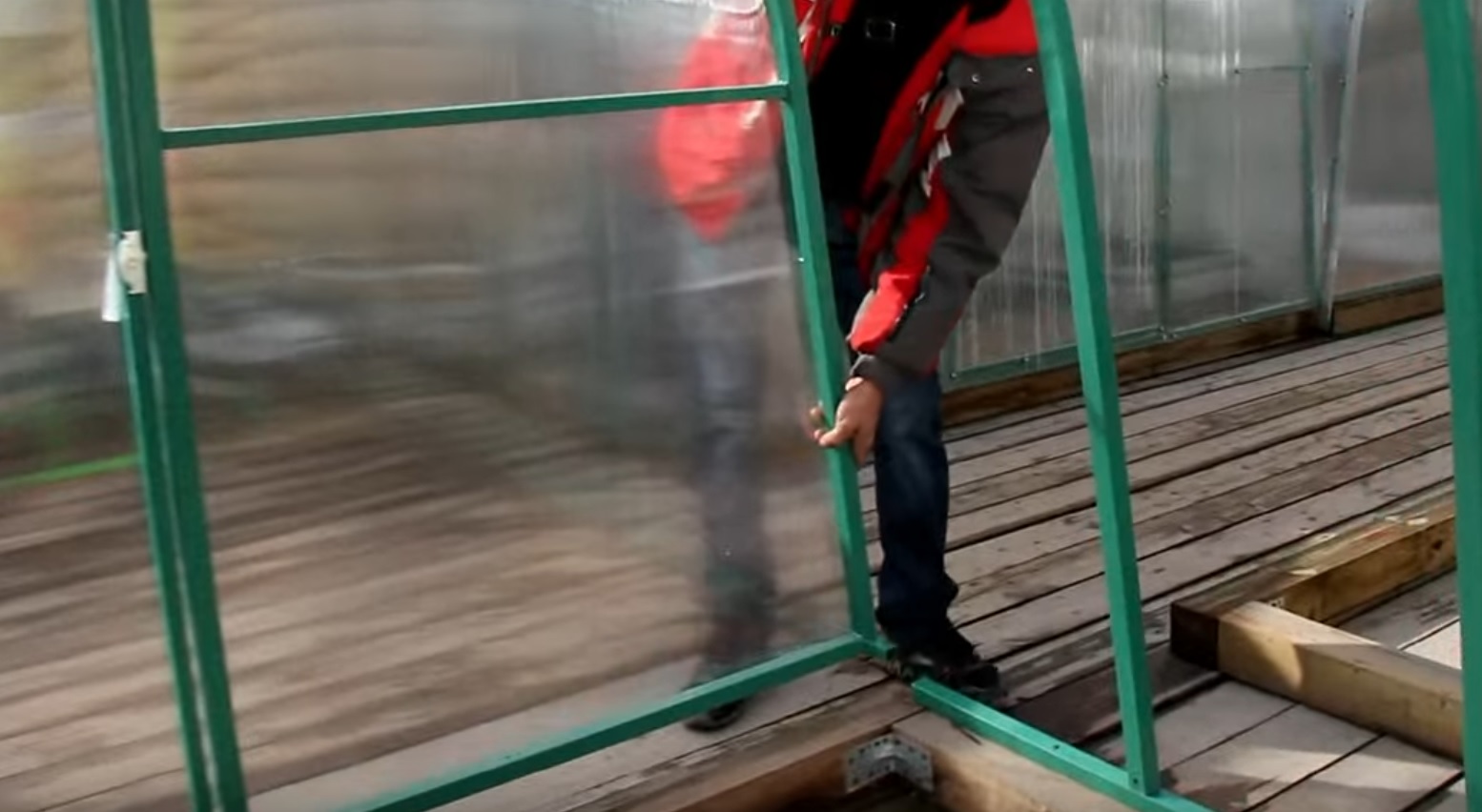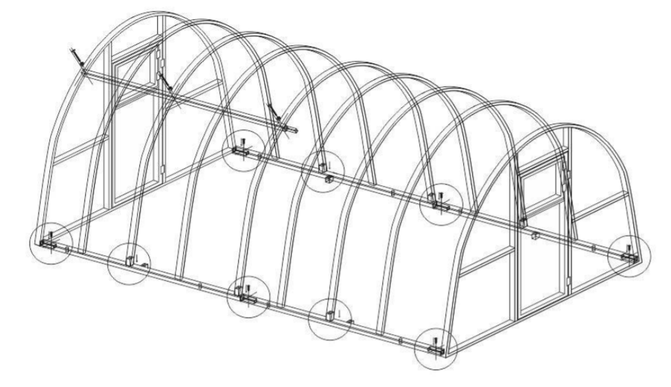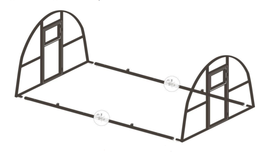 1. Собрать торцевые стойки, выполнить крепление дверной рамы и соответствующих распорок. При установке теплицы, в качестве фурнитуры для крепления следует использовать термошайбы.