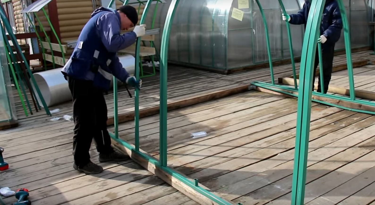 Внимание! Используя не усиленный каркас для теплицы, нужно быть готовым к тому, что во время сильного снегопада конструкция может сломаться. Теплица прослужит намного дольше, если использовать для ее каркаса рамный профиль с сечением 40×20 мм и толщиной стенок 1,5-2 мм.. Основные этапы монтажа каркаса: