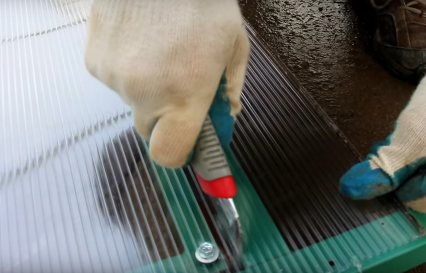 Шаг 8. Отделяем верхнюю часть поликарбоната от форточки. Подкладываем его часть (1 см) под поликарбонат, прикрученный к форточке, и крепим к верхней части торца.
