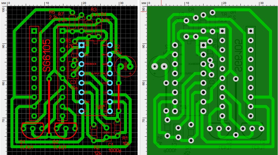 Прототип по нашим эскизам изготовил Виталий Ликин из Волгограда. При создании прототипа платы решено было пренебречь двумя TL431 из за особенностей этого блока. К стати, полезной фишкой такой платы является то, что если заменить R4 на переменный резистор с номиналом 10 кОм, можно уже получить уже блок питания с регулировкой напряжения от 0 В до 16,5 В.