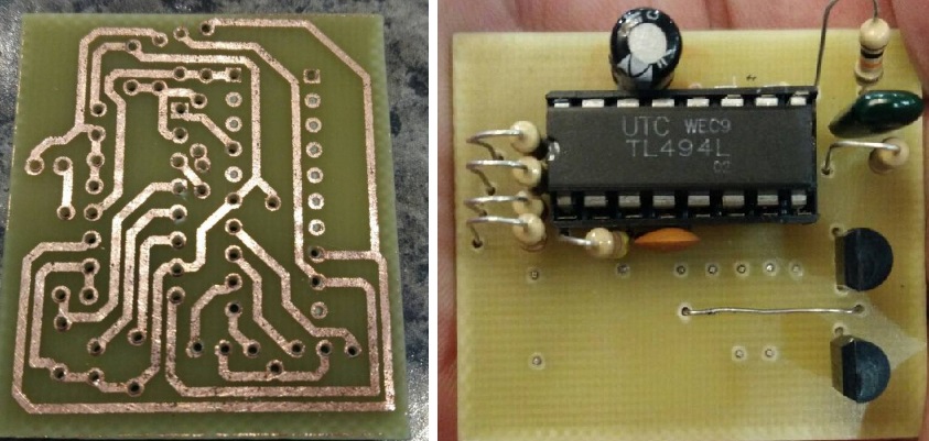 Далее изготовили плату–переходник с одной микросхемы на другую. Как видим, такой переходник имеет на борту TL494 с минимальной обвязкой для работы, а также две TL431. В некоторых блоках встроенные TL431 в SG6105 не задействованы, но в других отвечают за формирование напряжений по шине 3,3 В, а также дежурных 5 В.