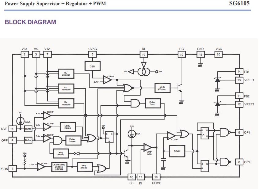 Особенностью ШИМ SG6105 является целый ряд встроенных защит, из-за чего производители обожают его использовать в своих блоках. SG6105 сразу может выключать блок при превышении (или при снижении) напряжения даже на одной из силовых шин, контролирует наличие отрицательных напряжений на выходе БП. А также имеет отдельные выходы для детекции перегрузки или другой нештатной аварийной ситуации. По сути, SG6105 имеет в своем составе TL494, два TL431 и кучу другой начинки, которая отвечает за вышеперечисленные защиты.