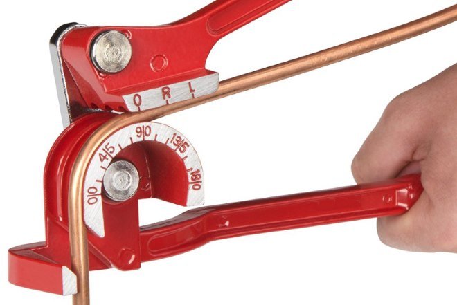 Медные трубки нужно гнуть с помощью специальных трубогибов (см. фото). Они не универсальные, рассчитаны на разный диаметр труб. Так как плотность их стенок зависит от сечения, то и диаметр круга трубогиба зависит от диаметра трубки.