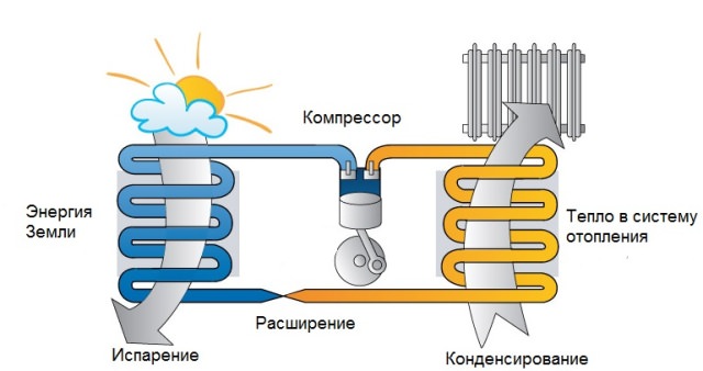 На рисунке схематически показана реализация принципа элементарного теплового насоса, разделенного компрессором и расширителем на два контура – высокого и низкого давления